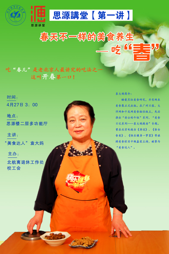 4月27日,由离退休工作处、校工会共同主办的KY开元思源讲堂首讲,邀请“美食达人”、曾在北京电视台《食全食美》等栏目担任嘉宾主持的 “袁大妈”带来: