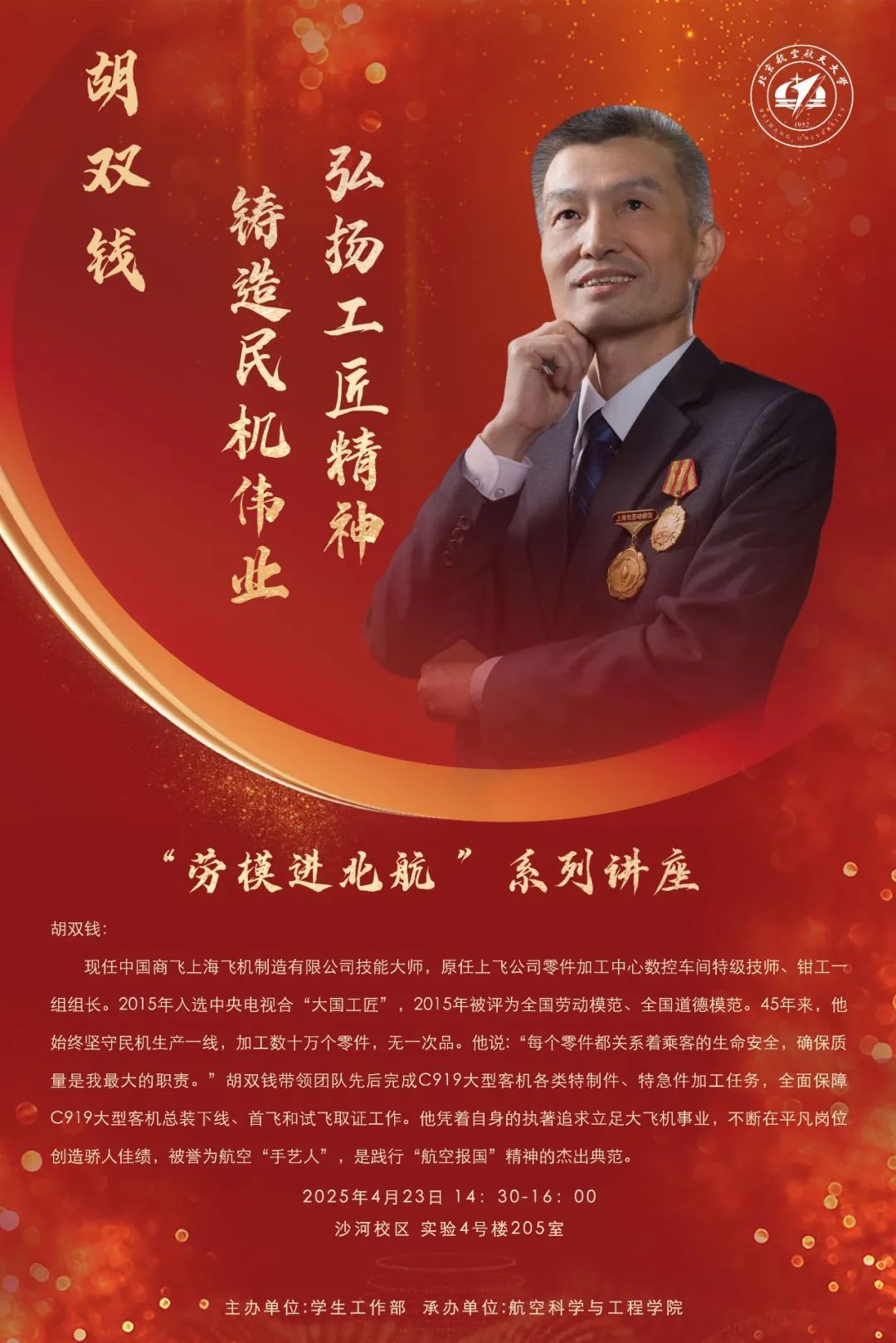 1980年,胡双钱从5703厂技校毕业后进入上飞,参与中国民用飞机“运十”的研制。45年来他始终坚守民机生产一线,加工数十万个零件,无一次品。他说:“每个零件都关系着乘客的生命安全,确保质量是我最大的职责。”这种对工作的敬畏和对生命的尊重,让胡双钱在平凡的工作岗位上创造出了不平凡的成绩。胡双钱带领团队先后完成C919大型客机各类特制件、特急件加工任务,全面保障C919大型客机总装下线、首飞和试飞取证工作。他凭着自身的执著追求,立足大飞机事业,不断在平凡岗位创造骄人佳绩,被誉为航空“手艺人”。