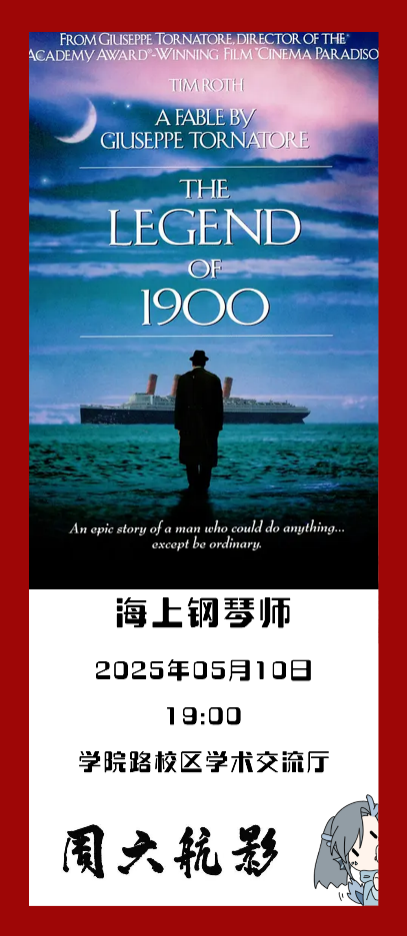 乐章不朽,传说永恒,本周「周六航影」,让我们一起走进《海上钢琴师》。跟随电影诗意的镜头语言,读懂现代人最深层的生存焦虑,超越一部仅仅关于音乐电影的认识,聆听一曲关于存在本质的哲学沉思。