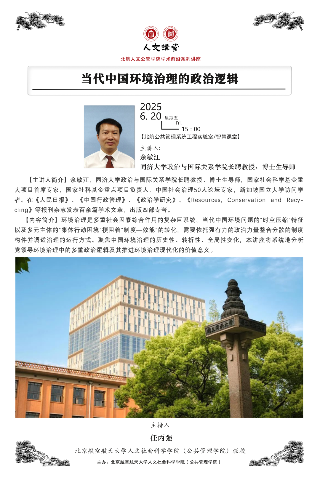 余敏江,同济大学政治与国际关系学院长聘教授、博士生导师,国家社会科学基金重大项目首席专家,国家社科基金重点项目负责人,中国社会治理50人论坛专家,新加坡国立大学访问学者。在《人民日报》、《中国行政管理》、《政治学研究》、《Resources, Conservation and Recycling》等报刊杂志发表百余篇学术文章,出版四部专著。
