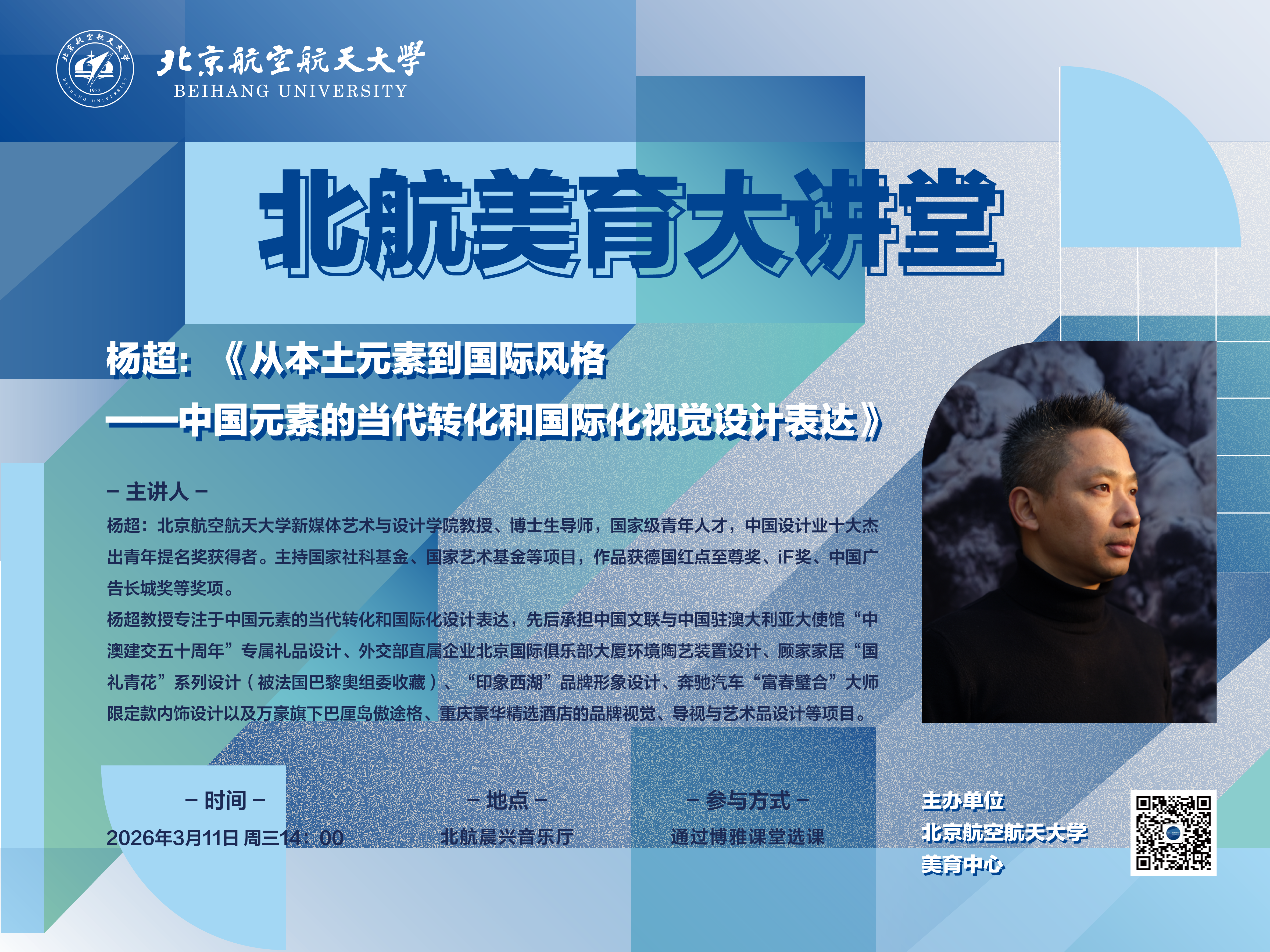 杨超教授的研究专注于将中国陶瓷文化等传统元素通过解变与重构的方式实现其国际化的视觉设计表达。此讲座以具体的获奖作品及实践项目为例阐述他的设计理念,以及其跨界的、开拓性的设计探索。