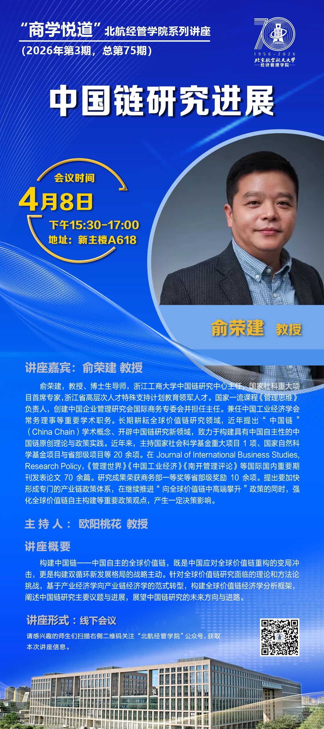 俞荣建,教授、博士生导师,浙江工商大学中国链研究中心主任。国家社科重大项目首席专家,浙江省高层次人才特殊支持计划教育领军人才。国家一流课程《管理思维》负责人,创建中国企业管理研究会国际商务专委会并担任主任。兼任中国工业经济学会常务理事等重要学术职务。