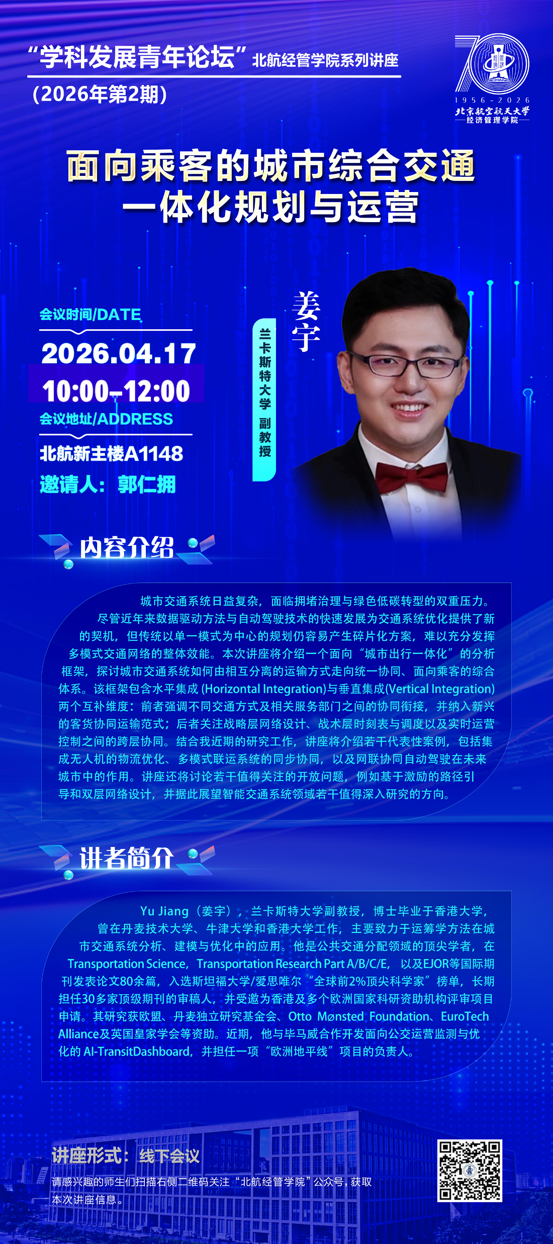 YuJiang(姜宇),兰卡斯特大学副教授,博士毕业于香港大学,曾在丹麦技术大学、牛津大学和香港大学工作,主要致力于运筹学方法在城市交通系统分析、建模与优化中的应用,是公共交通分配领域的顶尖学者。