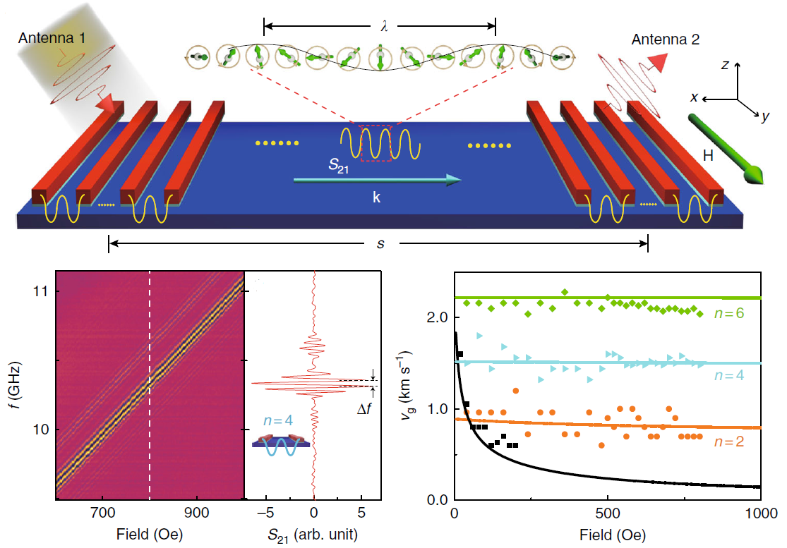 激发超短波长的自旋波能够减小器件尺寸,提高集成度,同时短波长对应着更高的频率,自旋逻辑器件也会有更快的运算速度。但想要激发出短波长自旋波可不容易,实验过程中所需测量的自旋波频率最高超过了30GHz,这已经接近目前测量系统的极限,为了获得令人信服的结果,于教授的团队通过长时间的校准和调试才得到了清晰的自旋波信号,为之后的进一步理论分析打下了可靠的基础。