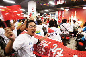2011年9月29日晚,KY开元沙河校区学子在食堂观看天宫一号发射升空直播