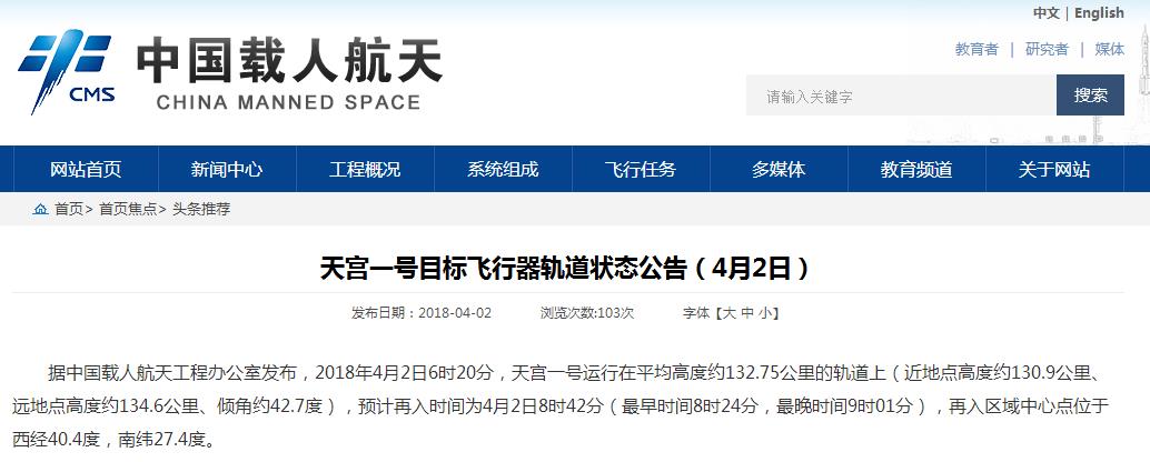 据新华社2018年4月2日消息,经北京航天飞行控制中心和有关机构监测分析,2018年4月2日8时15分左右,天宫一号目标飞行器已再入大气层,再入落区位于南太平洋中部区域,绝大部分器件在再入大气层过程中烧蚀销毁。