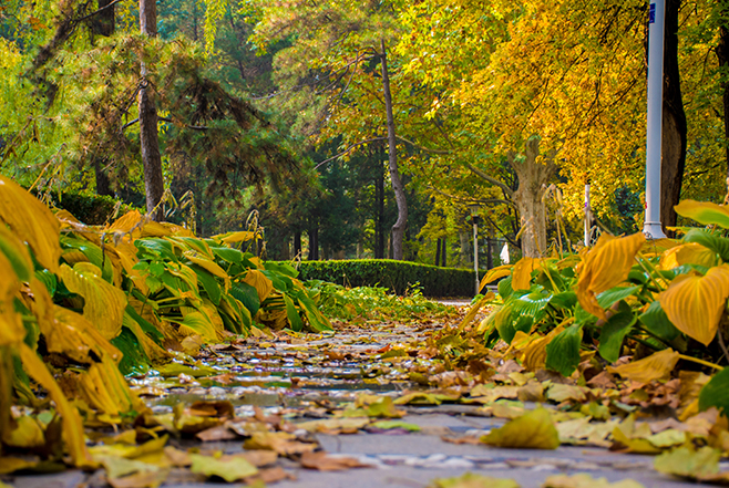 正好落叶纷纷扬扬,层林尽染,漫天盖地。