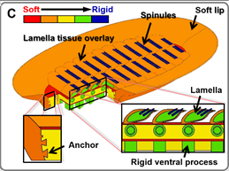 仿生模具(除上面的小刺之外)由多材料3D打印一次成形。设计之初由于仅用软硬两种材料来制作模具,导致样机吸附性不好且易开裂。不断尝试改良后,团队意识到人类的肌肉和骨骼之间是由半月板、韧带等组织逐渐过渡的,因此使用梯度硬度材料进行3D打印来解决材质的模拟问题。吸盘上的小刺尺度小且尖硬,3D打印技术无法满足要求的精度和硬度,于是文力老师课题组与美国哈佛大学的国际团队合作,利用激光雕刻技术制造了尺度、形状都和真实鱼高度相似的硬质小刺并在测试中效果较好。
